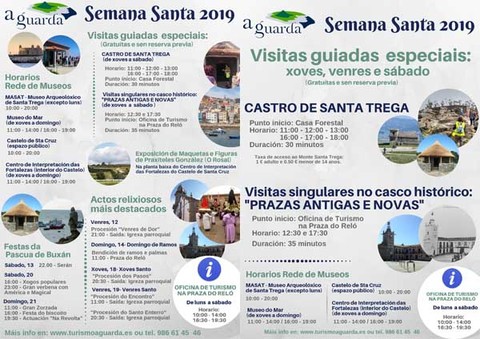 A Guarda entra xa de cheo na Semana Santa 2019 cun amplo programa de actividades culturais para goce da veciñanza e os milleiros de visitantes que cada ano se achegan ata a vila nesta tempada. Coma todos os anos A Guarda conta esta Semana Santa coas tradicionais procesións, visitas guiadas gratuítas, apertura da Rede de Museos, ademais de actividades festivas coma as Festas da Pascua de Buxán, a Exposición de maquetas e figuras de Praxíteles González ou o Concerto de Clarinete de Cintia Lomba