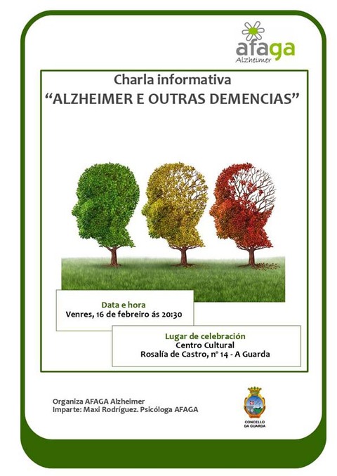O Centro Cultural acollerá mañá, 16 de febreiro, a charla «Alzheimer e outras demencias», organizada pola Asociación de Familiares de Enfermos de Alzhéimer e outras Demencias de Galicia (AFAGA) en colaboración co Concello da Guarda.