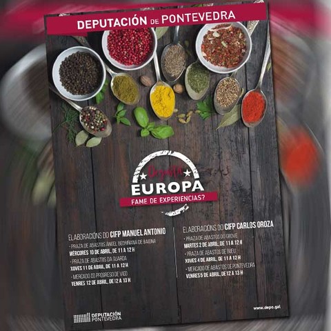 O programa Degusta Europa, impulsado pola Deputación de Pontevedra, chegará esta semana ata os mercados de abastos de Baiona -mércores 10-, da Guarda -xoves 11- e Vigo -Mercado do Progreso o venres 12- con propostas culinarias elaboradas polo alumnado do Centro Manuel Antonio de Vigo. Trátase dunha iniciativa programada e anual, que este ano xira en torno á campaña "Fame de Experiencias" centrada na enogastronomía, polo que se resaltan especialmente os produtos do mar e da terra da provincia, así como os viños e caldos das Rías Baixas. Ademais, todos as propostas culinarias teñen en conta pratos europeos, xa que a iniciativa faise, coma todos os anos, con motivo do Día de Europa.