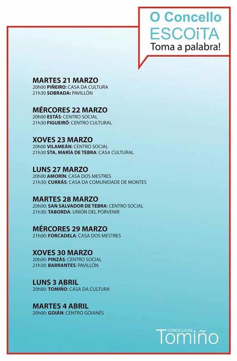 A iniciativa -O Concello Escoita- pretende, ademais de informar sobre proxectos que se están a executar, coñecer mellor as necesidades de cada parroquia e tomar nota das propostas veciñais