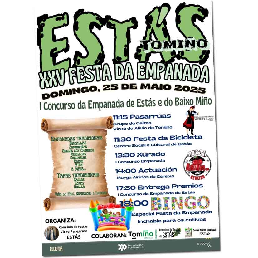 La Comisión de Festas da Virxe Peregrina de Estás organiza para este domingo 25 de mayo la XXV Festa da Empanada, una celebración culinaria con arraigada tradición en el municipio de Tomiño. Esta edición reviste una especial importancia al conmemorar el 25 aniversario de la que fue la primera fiesta gastronómica del Concello.