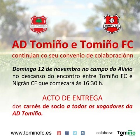 A Asociación Deportiva Tomiño de fútbol base e o Tomiño Fútbol Club seguen reforzando o seu convenio de colaboración e este domingo 12 farán entrega do carné de socio do equipo sénior tomiñés a cada xogador da AD Tomiño. O acto terá lugar no descanso do encontro que enfrontará ao Tomiño FC e ao Nigrán CF no campo do Alivio ás 16:30.