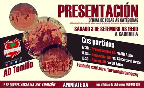 Unha tempada máis a AD Tomiño de fútbol base reúne a todas as súas categorías para presentalas ante a afección no campo de A Carballa. O acto, que comezará as 16:00 do sábado 3 de setembro, incluirá tamén encontros amigables das categorías de fútbol 8 Prebenxamín, Benxamín e Alevín.