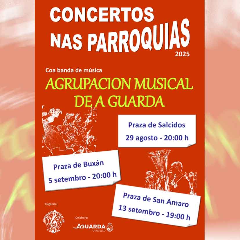 O programa, organizado coa colaboración do Concello da Guarda, inclúe tres actuacións en prazas emblemáticas das parroquias. O primeiro concerto terá lugar o venres 29 de agosto ás 20:00 horas na praza de Salcidos. A continuación, a música trasladarase á praza de Buxán o 5 de setembro ás 20:00 horas. O ciclo pecharase en Camposancos, na praza de San Amaro, o sábado 13 de setembro ás 19:00 horas.