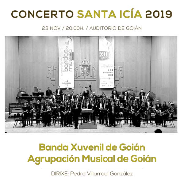 O próximo sábado 23 de Novembro ás 20:00 h. celebrarase no auditorio de Goián o tradicional concerto de Santa Icía, no que participarán a Agrupación Musical de Goián e a súa banda xuvenil baixo a batuta de Pedro Villarroel González.