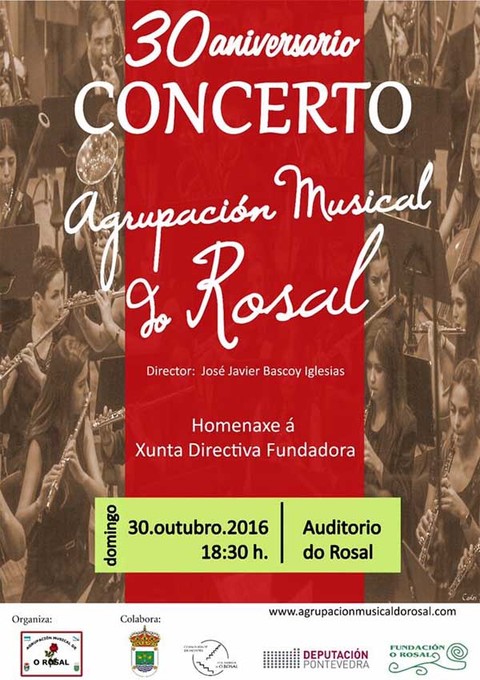 A Agrupación Musical do Rosal conmemora este vindeiro domingo día 30, a celebración do seu 30º Aniversario, cun concerto que ofrecerá a banda de música da Agrupación Musical do Rosal no Auditorio do Rosal, ás 18:30 horas.