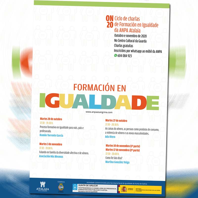 Co fin de fomentar a educación en igualdade desde o fogar e a escola, a ANPA Atalaia ofrece este ciclo de charlas nas que reflexionaremos sobre o xénero e os estereotipos na infancia, as novas masculinidades, a dimensión afectivo-sexual, a obxectivización sexual da muller e a violencia de xénero.