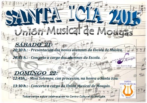 -Os actos de celebración do Día de Santa Icía rematarán ca xa tradicional "Comida de Confraternidade" que se celebrará no Restaurante O Peñasco de Mougás, no que músicos e familiares pasarán un bo rato recordando ós vellos compañeiros e contando as mellores anécdotas acaecidas o longo deste ano musical.