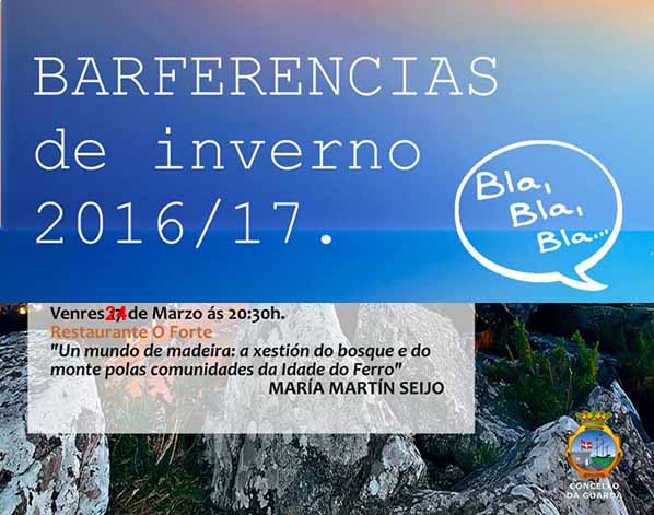 A barferencia programada para este venres 17 no restaurante O Forte aprázase para o vindeiro venres 24 de marzo por motivos de saúde da conferenciante. Será por tanto o vindeiro venres 24, no Restaurante O Forte ás 20:30h., cando María Martín Seijo, investigadora da Universidade de Santiago, especializada en arqueobotánica comparta cos alí presentes os seu estudios sobre o mundo do bosque na Idade do Ferro, e máis concretamente, nos explique as especies máis habituais e uso que as súas xentes lle daban na época castrexa. Coa celebración desta charla cerrarase o ciclo de Barferencias 2016/2017.
