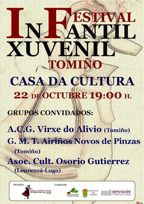 A Escola de Danzas e Gaitas Virxe do Alivio de Tomiño organiza este sábado día 22 de outubro ás 19:00h na Casa da Cultura de Tomiño un Festival Infantil Xuvenil de Folklore no que participarán: