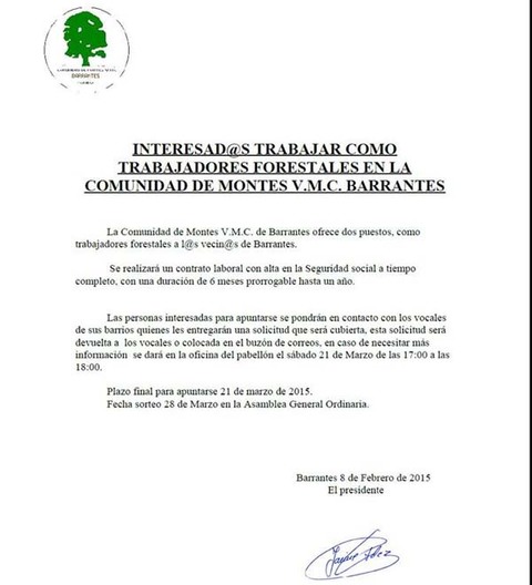 A COMUNIDADE DE MONTES DE BARRANTES BUSCA 2 TRABALLADORES FORESTAIS