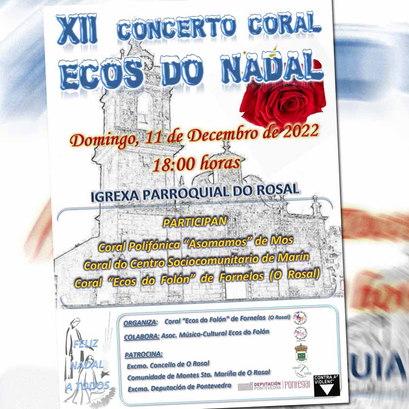Dende as 18.00 horas, o público poderá desfrutar de balde dun espectáculo no que a Coral Ecos do Folón estará acompañada pola Coral Polifónica ‘Asomamos’ de Mos, formada en 2009 e que retomou este 2022 de novo a actividade tras un parón de dous anos pola situación sanitaria con novos folgos e moita ilusión, e a Coral do Centro Sociocomunitario de Marín, que con 30 anos de historia reúne a 30 voces mixtas nun grupo de amigos e amigas afeccionados á música e ao canto.