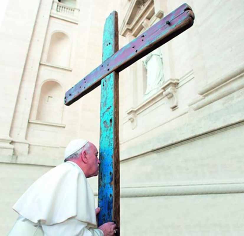A cruz foi levada a Roma o 9 de abril de 2014 para ser bendita polo Papa, quen suxeriu que se convertese nunha cruz peregrina que levase unha mensaxe de solidariedade a todo o mundo. Desde entón, ten viaxado a numerosos puntos coa súa mensaxe de paz e solidariedade.