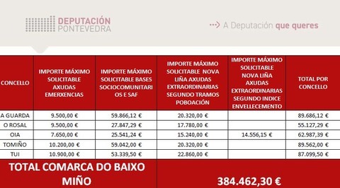 Os cinco concellos de menos de 20.000 habitantes da comarca do Baixo Miño xa teñen á súa disposición máis de 384.000 € en axudas para emerxencias sociais, que a Deputación de Pontevedra pon en marcha para facer fronte ás novas necesidades da crise sanitaria do coronavirus. Hoxe publícanse no BOPPO a nova liña de Axudas Sociais Extraordinarias, e o Plan de Servizos Comunitarios Básicos e o SAF, que xunto ás Axudas de Emerxencia, constitúen un fondo que ascende a máis de catro millóns de euros destinado aos concellos máis pequenos da provincia. (0,5 millóns de € das Axudas Básicas de Emerxencia, 2,2 millóns de € do Plan de Servizos Comunitarios Básicos e SAF e 1,3 da nova liña de Axudas Extraordinaria). En concreto, os concellos da comarca do Baixo Miño que xa poden pedir as axudas son A Guarda, O Rosal, Oia, Tomiño e Tui.