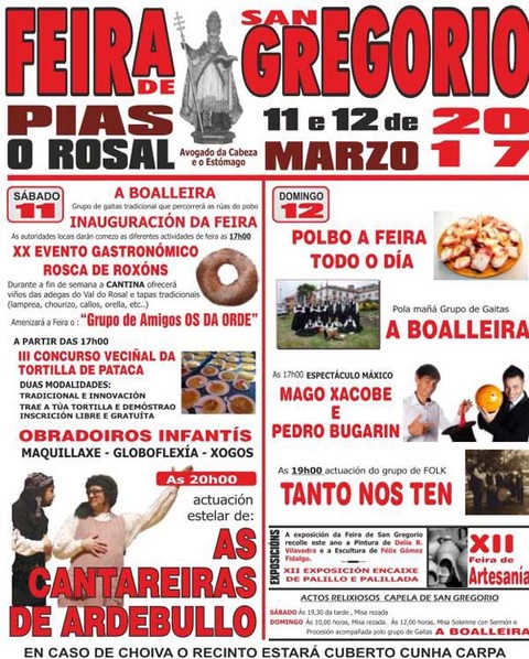 Un ano máis a Feira de San Gregorio, volverá a encher a esplanada da Estrada, no barrio de Pías, en O Rosal. Centos de persoas acuden cada ano a esta Feira que no 2017 terá lugar o Sábado 11 e Domingo 12 de Marzo.