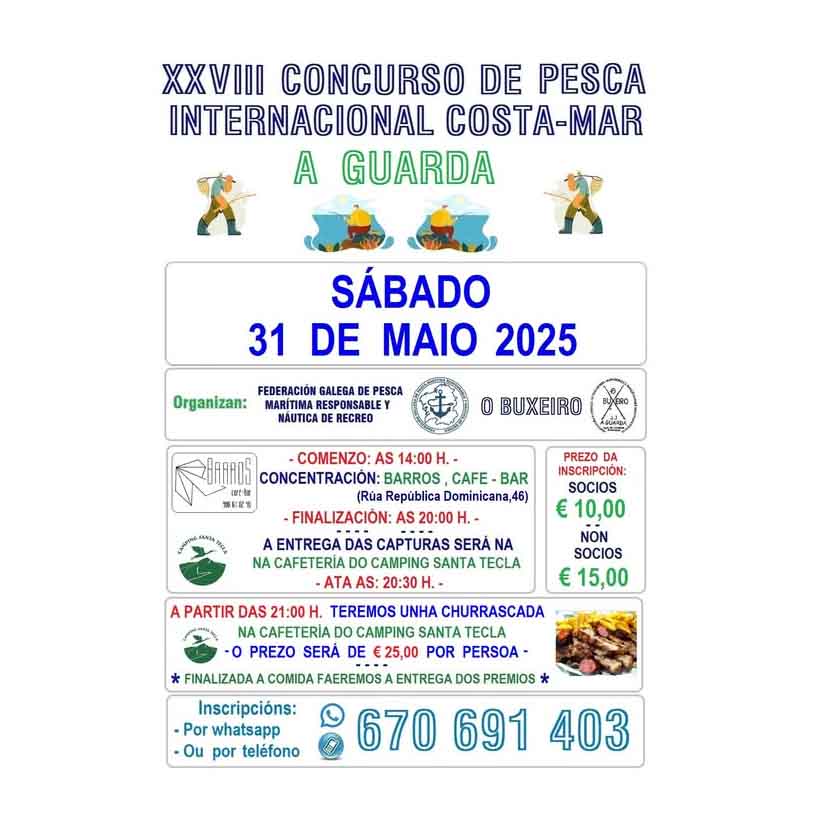 Las inscripciones están abiertas a través de WhatsApp en el número 670 691 403, con un coste de 10 € para socios de O Buxeiro y 15 € para no socios. Las capturas deberán entregarse antes de las 20:30 h en la cafetería del Camping Santa Tecla, donde también tendrá lugar la churrascada posterior, a partir de las 21:00 h, con un coste de 25 € por persona.