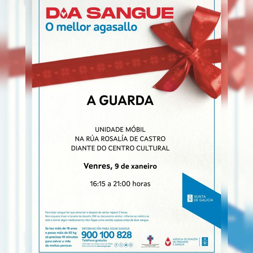 La unidad móvil de la Axencia de Doazón de Órganos e Sangue (ADOS) regresa a A Guarda este viernes 9 de enero en lo que será su primera visita del año 2026 al municipio. Una nueva oportunidad para que los vecinos y vecinas colaboren con la donación de sangre, en un momento en el que las reservas continúan en niveles bajos en varios grupos.