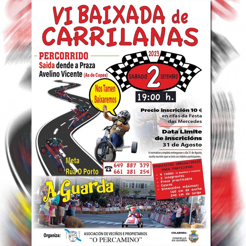 A Guarda acoge un año más su tradicional Baixada de Carrilanas, que el próximo 2 de septiembre llegará a su sexta edición. El evento, organizado por la Asociación de Veciños e Propietarios "O Percamino" con colaboración del Concello de A Guarda, comenzará a las 19.00 horas y seguirá el tradicional recorrido con salida en la Praza Avelino Vicente y meta en la calle O Porto.