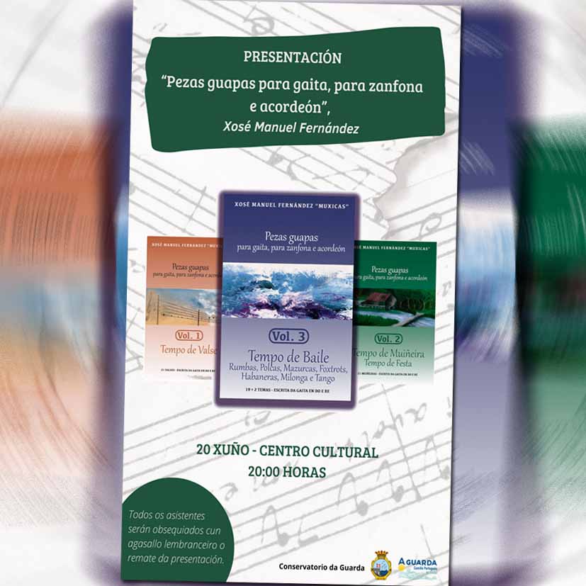 O Centro Cultural da Guarda será o escenario, o vindeiro luns día 20 de xuño ás 20:00h da tarde, para a presentación dos primeiros tres volumes de “Pezas guapas, para gaita, para zanfona e acordeón” de Xosé Manuel Fernández “Muxicas”.