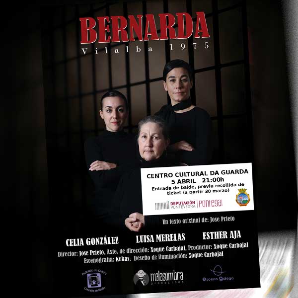 O Centro Cultural da Guarda será o escenario para a representación teatral de «Bernarda» a cargo da Compañía Malasombra Producións, prevista para o vindeiro venres día 5 de abril ás 21:00h.