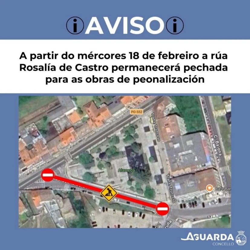 El Concello de A Guarda ha informado de que, a partir de este miércoles 18 de febrero, la calle Rosalía de Castro permanecerá cerrada al tráfico debido al inicio de las obras de peatonalización.