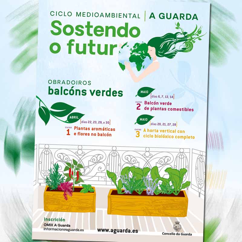 Dentro do Ciclo medioambiental Sostendo o futuro, a OMIX da Guarda, en colaboración con Medio ambiente, oferta tres obradoiros diferentes baixo o título Balcóns verdes, coa intención de aproveitar os balcóns ou terrazas para crear zonas verdes para gozar, para espertar o interese en cultivar á propia saúde e acadar momentos de alegría tanto para nós como para a comunidade en xeral todo coa axuda do mundo vexetal e a súa diversidade.