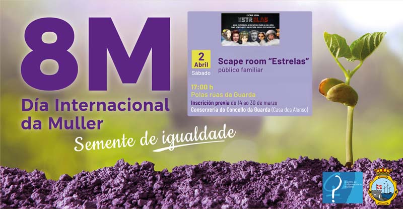 As actividades programadas polo Día Internacional da Muller estenderanse ao mes de abril de 2022, deste xeito o sábado día 2 de abril ás 17:00h, terá lugar o ESCAPE ROOM de Igualdade, polas rúas da Guarda, dirixido a público familiar.
