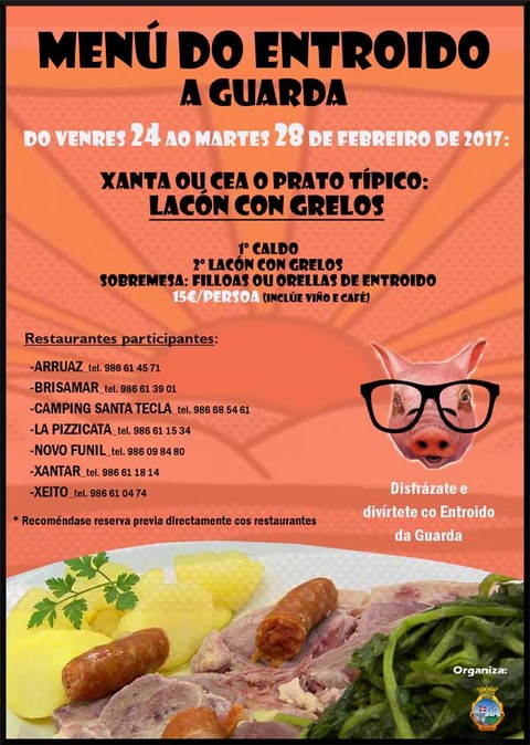 O Menú do Entroido repite na Guarda trala boa acollida do pasado ano e organízase novamente ampliando datas. Dende o venres 24 ata o martes 28 de febreiro, tanto para o xantar como para a cea, poderemos degustar o Menú de Entroido nos restaurantes adheridos.