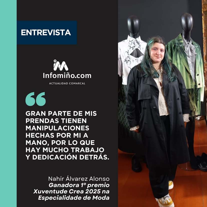 La joven diseñadora Nahir Álvarez Alonso, natural de A Guarda y graduada este año en la escuela de moda Formarte, se ha convertido en una de las finalistas del certamen de talento juvenil promovido por la Xunta de Galicia. Su propuesta, una colección de cinco looks titulada “La forma del miedo”, destaca por su carga conceptual, su minucioso trabajo artesanal y su inspiración en el cine de terror de los años 20. Con motivo de su selección, Infomiño.com conversa con ella para conocer su proceso creativo, su experiencia y su visión como nueva promesa de la moda gallega.
