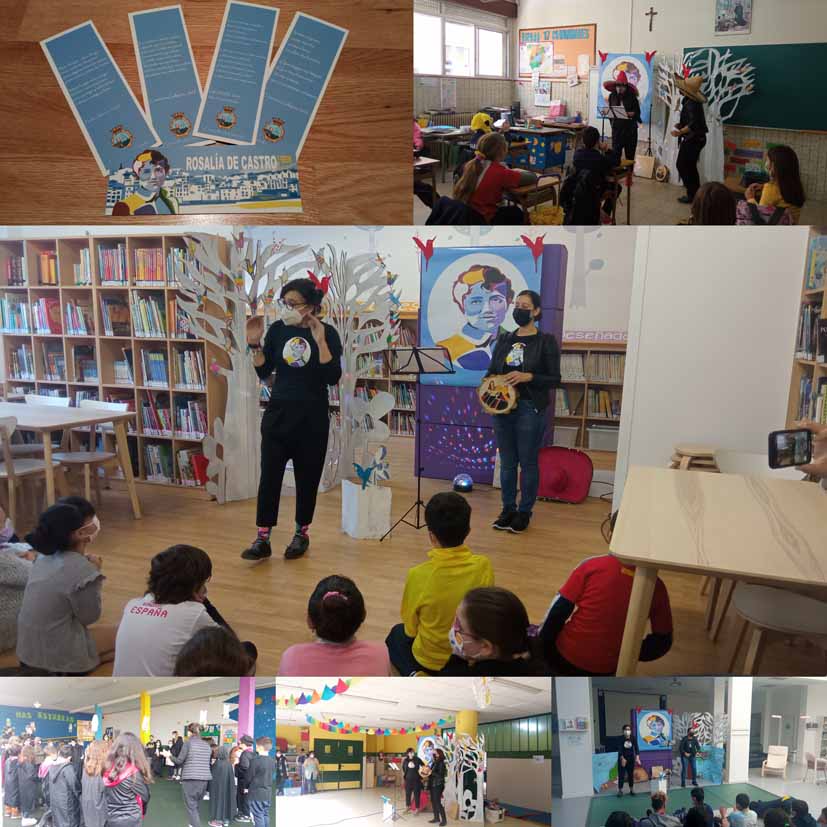 Pero sen dúbida a gran celebración tivo lugar co público escolar. Os seis centros de ensino da Guarda: San Xerome, A Sangriña, As Solanas, Manuel Rodríguez Sinde, PP Somascos e San José-HH.Carmelitas acolleron a actividade Rosalía cantareira coa que se fixo un exercicio de reactualización da figura de Rosalía a través da musicalidade dos seus versos. Irene Silva e Fatima Granja fixeron cos nenos de primaria unha actividade interactiva  para “sentir a Rosalía”, o obxectivo das artistas non é un coñecemento profundo da obra, senón contaxiar emocións e acabar sentido que a obra rosaliana transcendeu os seus 160 anos e segue a estar presente porque “lle falou ao pobo”. Para elo puxéronlle música de rancheira, rumba, rock e rap implicando aos alumnos nos retrousos dos poemas para entonar ao final ao unísono a ritmo de rap: “E canta se queres na lingua que eu falo”.