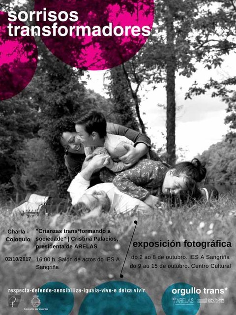 A traballadora social, docente e presidenta da Asociación de Familias de Menores Trans de Galicia (Arelas), Cristina Palacios, ofrecerá a charla-coloquio "Crianzas trans*formando a sociedade", dirixida ao público en xeral, no IES da Sangriña o 2 de outubro (16:00 h), inaugurando a exposición que permanecerá no instituto con acceso libre ata o día 8 de outubro. Previamente, presentarán a mostra o alcalde do Concello da Guarda, Antonio Lomba, e a deputada provincial de Emprego, Montserrat Magallanes. Do 9 ao 15 de outubro, a mostra poderá visitarse no Centro Cultural.
