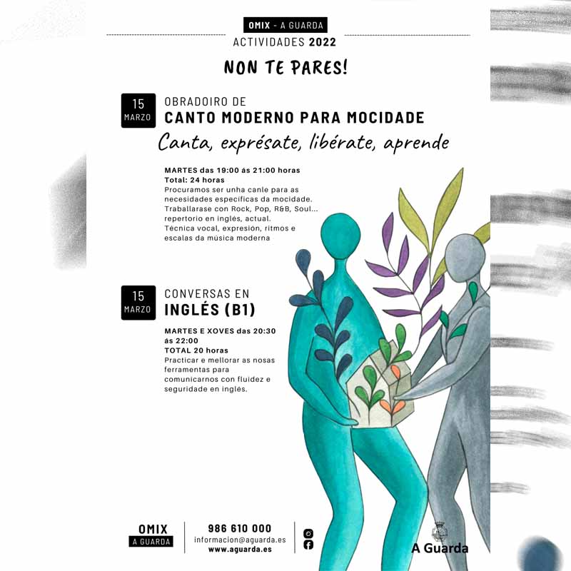 Un Obradoiro de Música e Canto Moderno e outro de Conversas en Inglés serán as propostas da Omix da Guarda para este mes de marzo de 2022.