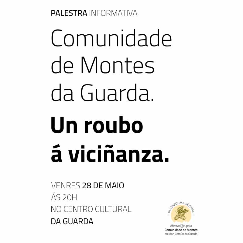 Este venres 28, no Centro Cultural da Guarda, a Plataforma de Afectadxs pola Comunidade de Montes da Guarda, celebraremos unha palestra informativa sobre a problemática que estamos a sufrir mais de 40 veciñ@s desde hai 3 anos, con esta Comunidade.