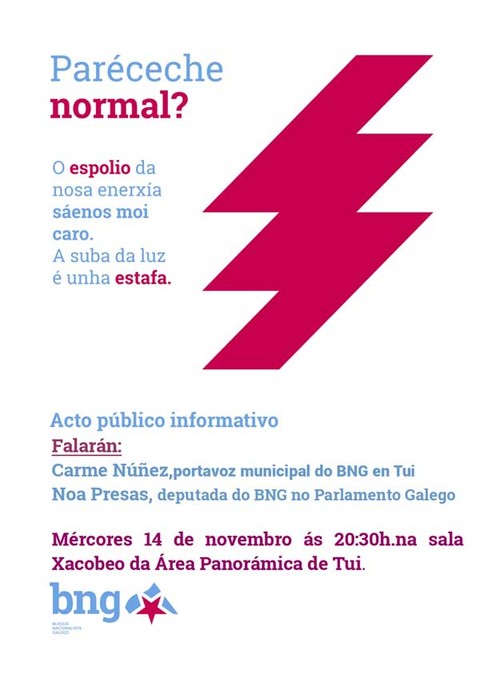 O Bloque Nacionalista Galego de Tui organiza este mércores ás 20:30 horas unha charla sobre a nova suba da luz e a tarifa eléctrica na sala Xacobeo da Área Panorámica. A cuestión enerxética é un dos eixos da actuación política da organización nacionalista e por iso está a desenvolver actos por todo o país para explicar os beneficios que tería para a poboación e para as empresas galegas a implementación dunha tarifa eléctrica propia coa que loitar contra un fenómeno preocupante como é o da pobreza enerxética e tamén contra a perda de competitividade polos altos custos da factura eléctrica.