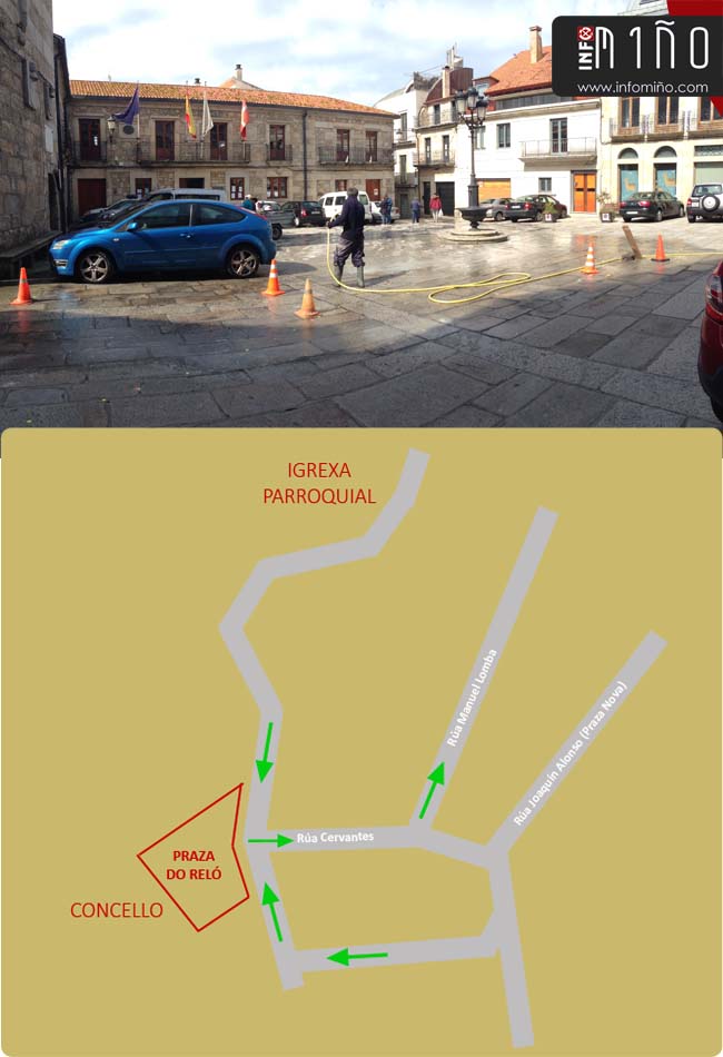 Dende esta maña, a empresa encargada da execución das obras, traballa na delimitación do espazo, para que os turismos que se acheguen ata a Praza do Concello dende a zona da Igrexa Parroquial e dende a Praza do Monterreal, circulen despois pola Rúa Cervantes, elimínase deste xeito a saída pola Rúa Calvario.