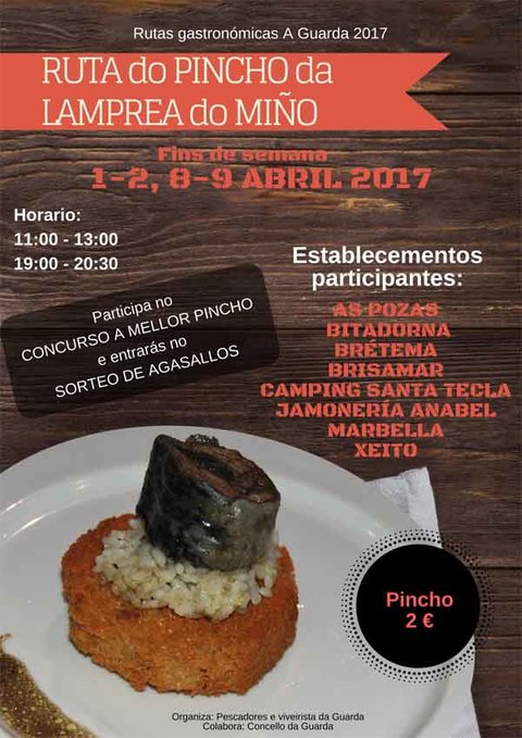 Antes do peche da temporada da captura da lamprea celebrarase esta ruta durante catro días repartidos durante o próximos fines de semana: o sábado 1 e domingo 2 e o sábado 8 e domingo 9 de abril. Polo que veciños da Guarda, visitantes e turistas poderán degustar do pincho da Lamprea do Miño de 11.00 a 13.30 horas e de 19.00 a 20.30 horas a un prezo único de 2 €.
