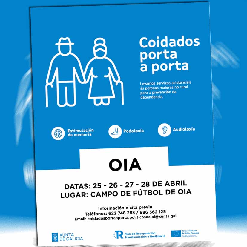 A unidade móbil do programa “Coidados porta a porta” que a Xunta de Galicia vén de poñer en marcha visitará Oia este mes de abril, ofrecendo consultas de audioloxía, podoloxía e estimulación de memoria. O vehículo situarase na explanada do campo de fútbol de Oia os días 25, 26, 27 e 28 deste mes.
