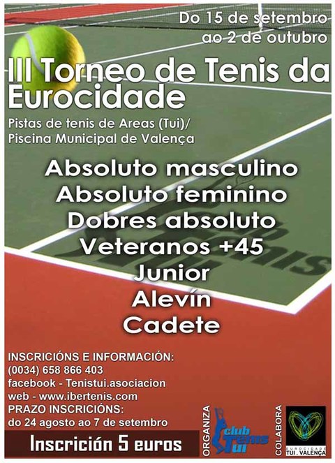 Dende o pasado mércores, 24 de agosto, e até o mércores 7 de setembro permanecerán abertas as inscricións para o "III Torneo de Tenis da Eurocidade", que novamente organiza o Club Tenis Tui, coa colaboración da Eurocidade Tui-Valença. Este torneo disputarase nas pistas de tenis de Areas, en Tui, e nas pistas de tenis da piscina municipal de Valença, dende o 15 de setembro ata o 2 de outubro.