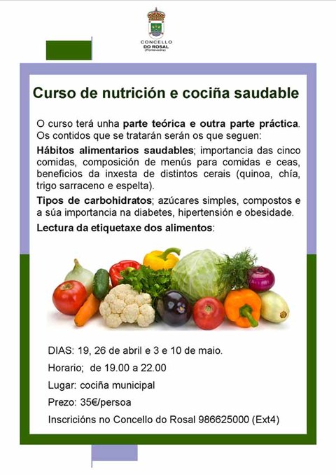 O cursiño estará impartido, a parte teórica, por un nutricionista rosaleiro e a parte práctica por unha cociñeira con amplia experiencia no eido da restauración coñecida por moitos dos que xa participástedes nos cursos de cociña do Rosal. Podedes chamarnos ó 986 625000 ext 4 para anotarvos.