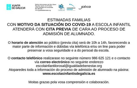 O contacto telefónico realizarase a través do número 986 625 121, mentres que o contacto vía correo electrónico será a través do enderezo escolainfantilorosal@igualdadebenestar.org.