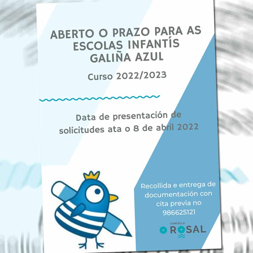 A escola infantil A Galiña Azul do Rosal xa ten aberto o seu proceso de admisión de alumnado para o curso 2022/23. O prazo de presentación de solicitudes rematará o vindeiro venres 8 de abril, como recolle a Resolución do 8 de marzo pola que se convoca este procedemento para as escolas infantís 0-3 dependentes do Corsorcio Galego de Igualdade e Benestar da Xunta de Galicia.