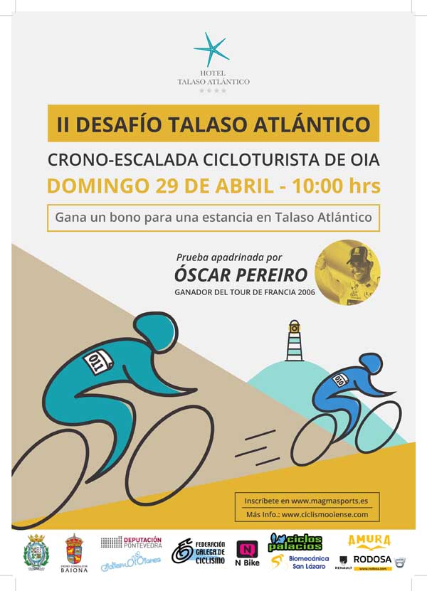 La localidad pontevedresa de Oia acogerá el domingo 29 de Abril, la segunda edición del DESAFÍO TALASO ATLÁNTICO, Crono-Escalada Cicloturista: Monasterio de Oia - A Valga - Alto da Groba. Prueba organizada por Ciclismo Oiense, autorizada por la FGC y apadrinada por OSCAR PEREIRO, vencedor del Tour de Francia del año 2006.