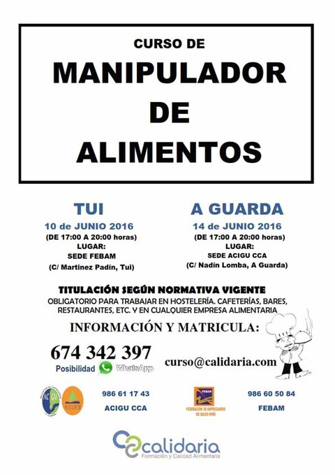 Los cursos de Manipulador de Alimentos se realizan el día 10 de Junio, viernes, en Tui, sede de Febam, de 5 a 8 de la tarde en A Guarda, sede de Acigu CCA de 17 a 20 horas, y el martes 14 en A Guarda, sede de Acigu CCA también de 17 a 20 horas. Esta formación va dirigida a todo el público, habiendo descuentos para grupos y asociados. La matricula se realiza en los teléfonos 674 342 397 - 986 605 084 - 986 611 743, o en las sedes de ACIGU CCA y FEBAM.