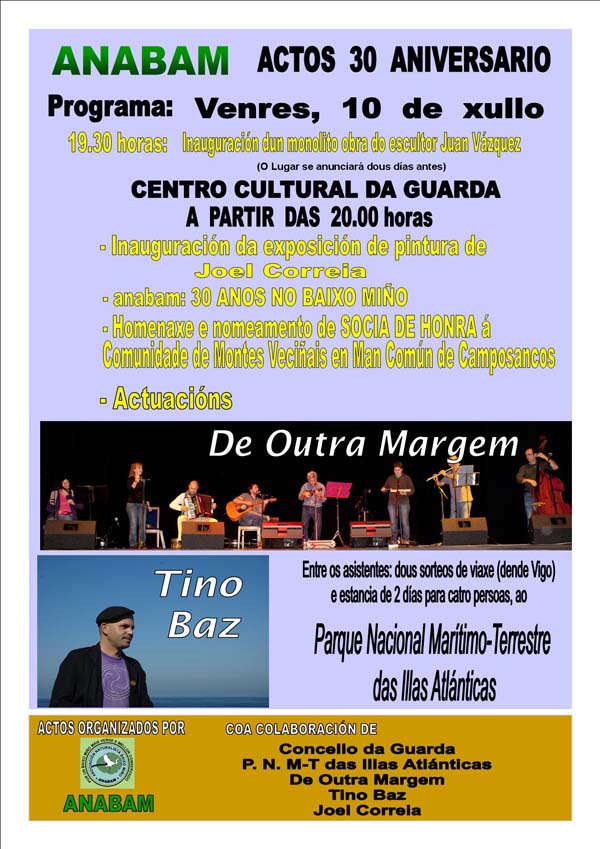 Para celebrar o 30 aniversario de ANABAM, esta asociación desenvolverá unha serie de actos que terán lugar o vindeiro venres, 10 de xullo, a partir das 8 da tarde, no Centro Cultural da Guarda.