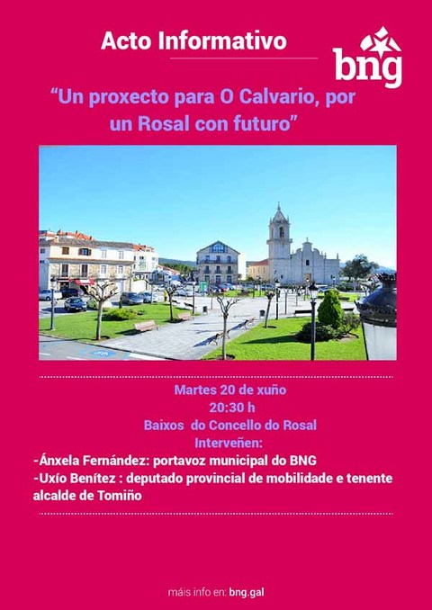 O vindeiro martes 20 de xuño ás 20:30 horas nos baixos do Concello do Rosal, o BNG vai realizar un acto informativo baixo o título "Un proxecto para O Calvario, por un Rosal con futuro", no que a formación nacionalista presentará a súa visión da praza do Calvario dentro dun proxecto de mobilidade sustentábel no que teñen prioridade as persoas.
