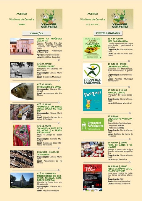 Agenda Semanal do Município de Vila Nova de Cerveira para o período entre 13 e 14 de junho
