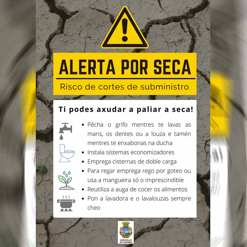 O Concello da Guarda atópase actualmente nunha situación alarmante de seca que, en caso de seguir agravándose, podería ter como consecuencia cortes no subministro. Por iso, queremos apelar de novo á cidadanía a facer un uso responsable dos recursos hídricos, esforzándonos por adoptar hábitos que permitan evitar o corte da auga e a optimización do uso da mesma.