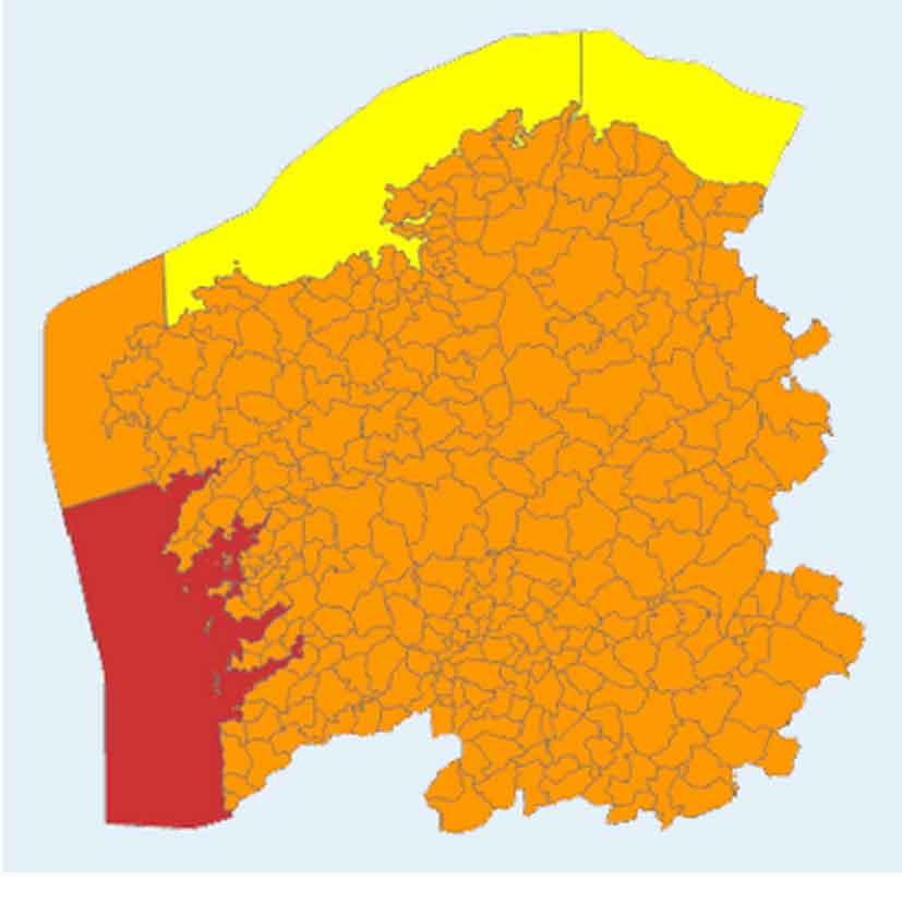 El Baixo Miño también está bajo alerta naranja debido a lluvias intensas en un periodo de 12 horas, vientos fuertes, y olas en el mar