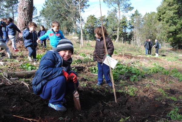 Case noventa escolares do Ceip Mestre Manuel García de Oia axudaron a plantar corenta árbores para un xardín botánico de diferentes especies arbóreas, impulsado pola Comunidade de Montes de Mougás no marco do proxecto Costa dos Castros.