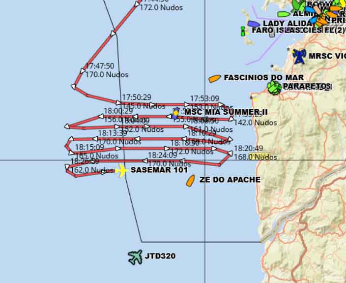 Sobre las 18h de la tarde de este domingo se ha desplazado hasta la zona el avión de Salvamento Marítimo SASEMAR 101, que realizó un vuelo de reconocimiento desde la zona de Cabo Silleiro hasta la desembocadura del río Miño, dando varias pasadas utilizando sus sistemas de Rádar de búsqueda 360º, Cámara IR/TV y el Rádar de barrido lateral SLAR